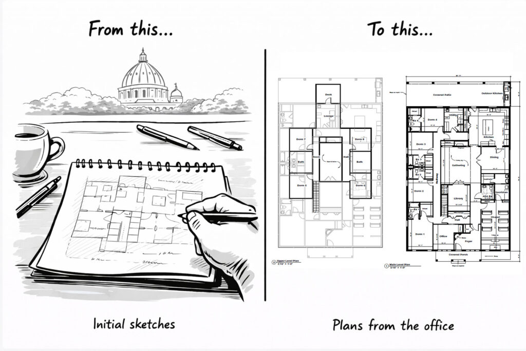 That evening, over dinner in Rome, we spread the drawings out and began refining them together — making adjustments, discussing ideas, and shaping his vision. What started as a simple sketch on a notepad was quickly evolving into something much more defined.